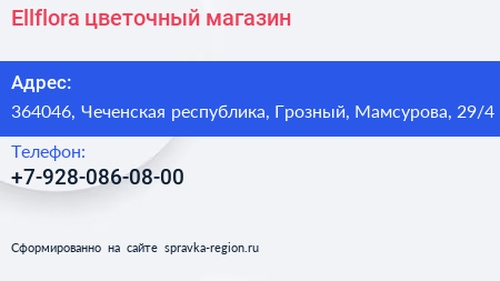 Ellflora, цветочный магазин по адресу 364046, Чеченская республика, Грозный, Мамсурова, 29/4 в дальнейшем Организация, размещена в следующих категориях: