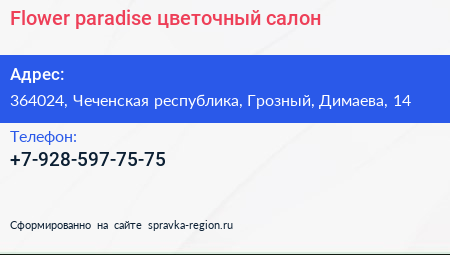 Flower paradise, цветочный салон по адресу 364024, Чеченская республика, Грозный, Димаева, 14 в дальнейшем Организация, размещена в следующих категориях: