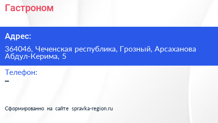 Гастроном по адресу 364046, Чеченская республика, Грозный, Арсаханова Абдул-Керима, 5 в дальнейшем Организация, размещена в следующих категориях: