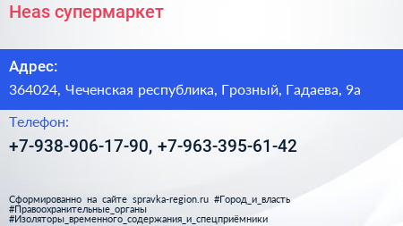 Heas, супермаркет по адресу 364024, Чеченская республика, Грозный, Гадаева, 9а в дальнейшем Организация, размещена в следующих категориях: