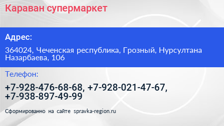 Караван, супермаркет по адресу 364024, Чеченская республика, Грозный, Нурсултана Назарбаева, 106 в дальнейшем Организация, размещена в следующих категориях: