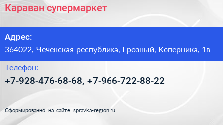 Караван, супермаркет по адресу 364022, Чеченская республика, Грозный, Коперника, 1в в дальнейшем Организация, размещена в следующих категориях: