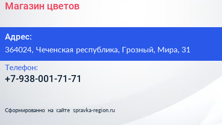 Магазин цветов по адресу 364024, Чеченская республика, Грозный, Мира, 31 в дальнейшем Организация, размещена в следующих категориях: