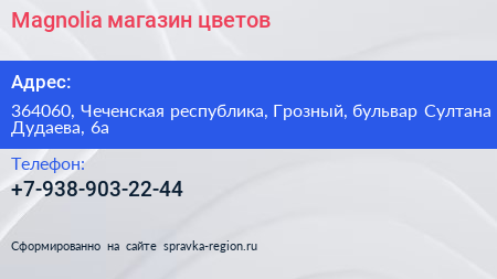 Magnolia, магазин цветов по адресу 364060, Чеченская республика, Грозный, бульвар Султана Дудаева, 6а в дальнейшем Организация, размещена в следующих категориях: