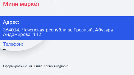 Мини-маркет по адресу 364014, Чеченская республика, Грозный, Абузара Айдамирова, 142 в дальнейшем Организация, размещена в следующих категориях: