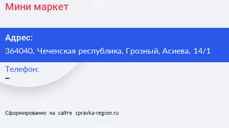 Мини-маркет по адресу 364040, Чеченская республика, Грозный, Асиева, 14/1 в дальнейшем Организация, размещена в следующих категориях: