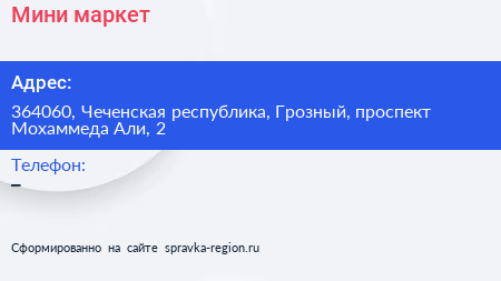 Мини-маркет по адресу 364060, Чеченская республика, Грозный, проспект Мохаммеда Али, 2 в дальнейшем Организация, размещена в следующих категориях: