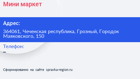 Мини-маркет по адресу 364061, Чеченская республика, Грозный, Городок Маяковского, 150 в дальнейшем Организация, размещена в следующих категориях: