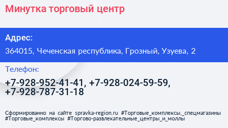 Минутка, торговый центр по адресу 364015, Чеченская республика, Грозный, Узуева, 2 в дальнейшем Организация, размещена в следующих категориях: