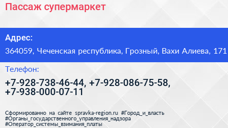 Пассаж, супермаркет по адресу 364059, Чеченская республика, Грозный, Вахи Алиева, 171 в дальнейшем Организация, размещена в следующих категориях: