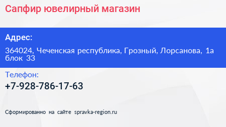 Сапфир, ювелирный магазин по адресу 364024, Чеченская республика, Грозный, Лорсанова, 1а блок 33 в дальнейшем Организация, размещена в следующих категориях: