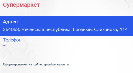 Супермаркет по адресу 364063, Чеченская республика, Грозный, Сайханова, 114 в дальнейшем Организация, размещена в следующих категориях:
