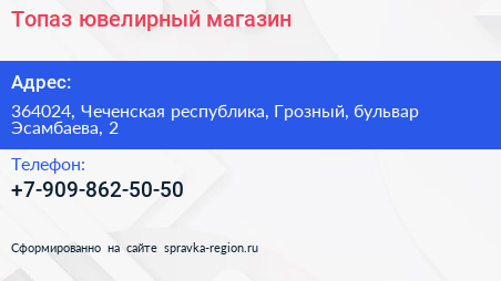 Топаз, ювелирный магазин по адресу 364024, Чеченская республика, Грозный, бульвар Эсамбаева, 2 в дальнейшем Организация, размещена в следующих категориях: