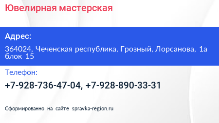 Ювелирная мастерская по адресу 364024, Чеченская республика, Грозный, Лорсанова, 1а блок 15 в дальнейшем Организация, размещена в следующих категориях: