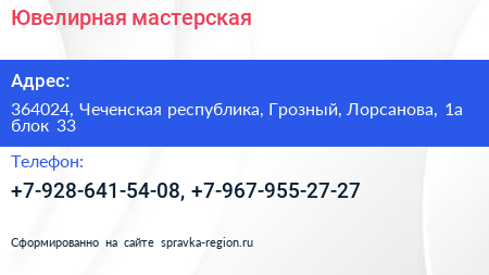 Ювелирная мастерская по адресу 364024, Чеченская республика, Грозный, Лорсанова, 1а блок 33 в дальнейшем Организация, размещена в следующих категориях: