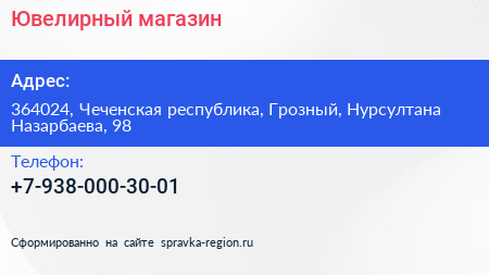 Ювелирный магазин по адресу 364024, Чеченская республика, Грозный, Нурсултана Назарбаева, 98 в дальнейшем Организация, размещена в следующих категориях: