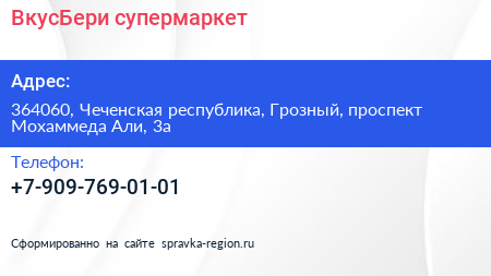 ВкусБери, супермаркет по адресу 364060, Чеченская республика, Грозный, проспект Мохаммеда Али, 3а в дальнейшем Организация, размещена в следующих категориях: