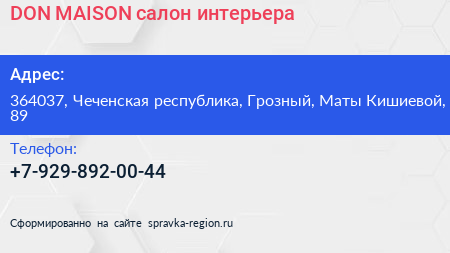 DON MAISON, салон интерьера по адресу 364037, Чеченская республика, Грозный, Маты Кишиевой, 89 в дальнейшем Организация, размещена в следующих категориях: