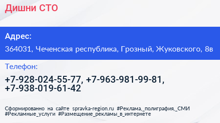 Дишни, СТО по адресу 364031, Чеченская республика, Грозный, Жуковского, 8в в дальнейшем Организация, размещена в следующих категориях: