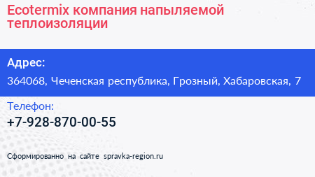Ecotermix, компания напыляемой теплоизоляции по адресу 364068, Чеченская республика, Грозный, Хабаровская, 7 в дальнейшем Организация, размещена в следующих категориях: