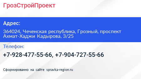 ГрозСтройПроект по адресу 364024, Чеченская республика, Грозный, проспект Ахмат-Хаджи Кадырова, 3/25 в дальнейшем Организация, размещена в следующих категориях: