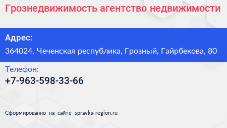 Грознедвижимость, агентство недвижимости по адресу 364024, Чеченская республика, Грозный, Гайрбекова, 80 в дальнейшем Организация, размещена в следующих категориях: