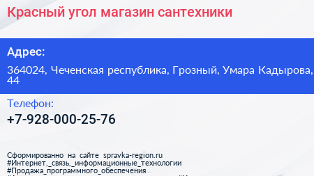 Красный угол, магазин сантехники по адресу 364024, Чеченская республика, Грозный, Умара Кадырова, 44 в дальнейшем Организация, размещена в следующих категориях: