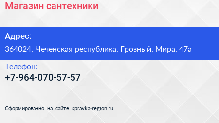 Магазин сантехники по адресу 364024, Чеченская республика, Грозный, Мира, 47а в дальнейшем Организация, размещена в следующих категориях: