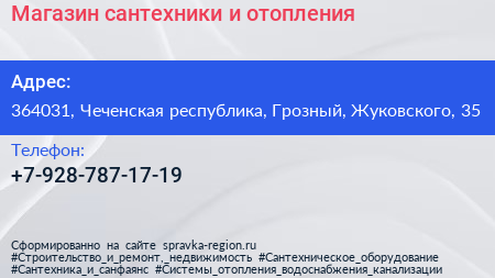 Магазин сантехники и отопления по адресу 364031, Чеченская республика, Грозный, Жуковского, 35 в дальнейшем Организация, размещена в следующих категориях: