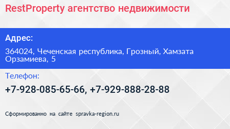 RestProperty, агентство недвижимости по адресу 364024, Чеченская республика, Грозный, Хамзата Орзамиева, 5 в дальнейшем Организация, размещена в следующих категориях: