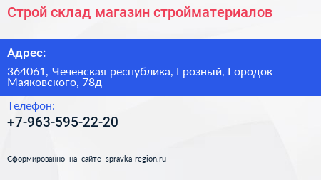Строй склад, магазин стройматериалов по адресу 364061, Чеченская республика, Грозный, Городок Маяковского, 78д в дальнейшем Организация, размещена в следующих категориях: