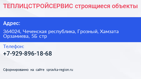 ТЕПЛИЦСТРОЙСЕРВИС, строящиеся объекты по адресу 364024, Чеченская республика, Грозный, Хамзата Орзамиева, 5Б стр в дальнейшем Организация, размещена в следующих категориях:
