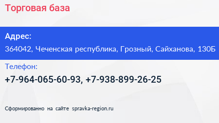 Торговая база по адресу 364042, Чеченская республика, Грозный, Сайханова, 130Б в дальнейшем Организация, размещена в следующих категориях: