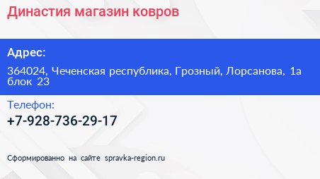 Династия, магазин ковров по адресу 364024, Чеченская республика, Грозный, Лорсанова, 1а блок 23 в дальнейшем Организация, размещена в следующих категориях: