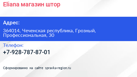 Eliana, магазин штор по адресу 364014, Чеченская республика, Грозный, Профессиональная, 30 в дальнейшем Организация, размещена в следующих категориях: