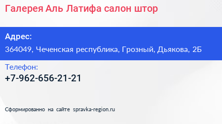Галерея Аль Латифа, салон штор по адресу 364049, Чеченская республика, Грозный, Дьякова, 2Б в дальнейшем Организация, размещена в следующих категориях: