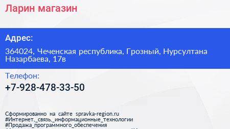 Ларин, магазин по адресу 364024, Чеченская республика, Грозный, Нурсултана Назарбаева, 17в в дальнейшем Организация, размещена в следующих категориях: