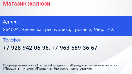Магазин жалюзи по адресу 364024, Чеченская республика, Грозный, Мира, 42а в дальнейшем Организация, размещена в следующих категориях: