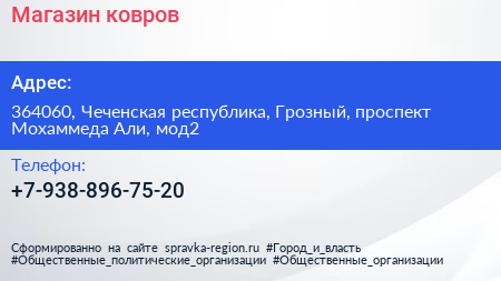 Магазин ковров по адресу 364060, Чеченская республика, Грозный, проспект Мохаммеда Али, мод2 в дальнейшем Организация, размещена в следующих категориях:
