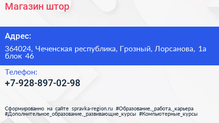 Магазин штор по адресу 364024, Чеченская республика, Грозный, Лорсанова, 1а блок 46 в дальнейшем Организация, размещена в следующих категориях: