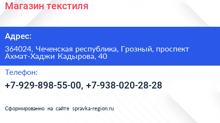 Магазин текстиля по адресу 364024, Чеченская республика, Грозный, проспект Ахмат-Хаджи Кадырова, 40 в дальнейшем Организация, размещена в следующих категориях: