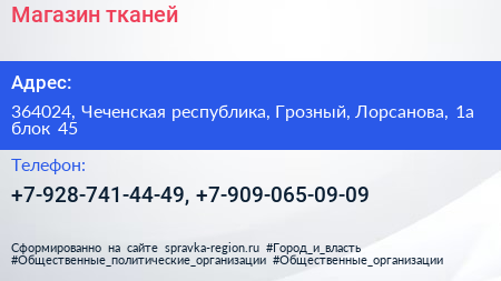 Магазин тканей по адресу 364024, Чеченская республика, Грозный, Лорсанова, 1а блок 45 в дальнейшем Организация, размещена в следующих категориях: