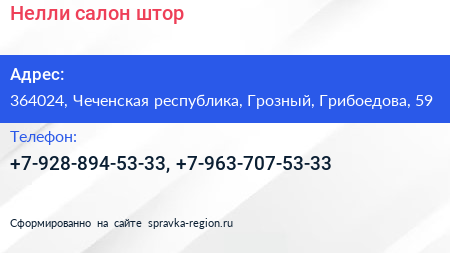 Нелли, салон штор по адресу 364024, Чеченская республика, Грозный, Грибоедова, 59 в дальнейшем Организация, размещена в следующих категориях: