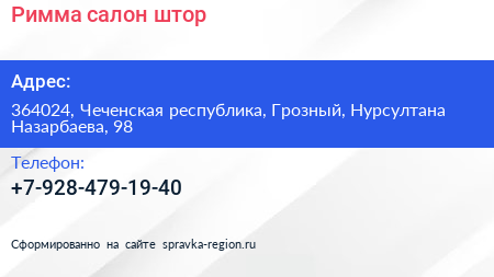 Римма, салон штор по адресу 364024, Чеченская республика, Грозный, Нурсултана Назарбаева, 98 в дальнейшем Организация, размещена в следующих категориях: