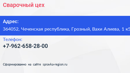 Сварочный цех по адресу 364052, Чеченская республика, Грозный, Вахи Алиева, 1 к5 в дальнейшем Организация, размещена в следующих категориях:
