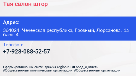 Тая, салон штор по адресу 364024, Чеченская республика, Грозный, Лорсанова, 1а блок 4 в дальнейшем Организация, размещена в следующих категориях: