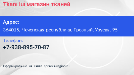 Tkani-lui, магазин тканей по адресу 364015, Чеченская республика, Грозный, Узуева, 95 в дальнейшем Организация, размещена в следующих категориях: