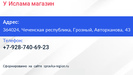 У Ислама, магазин по адресу 364024, Чеченская республика, Грозный, Авторханова, 43 в дальнейшем Организация, размещена в следующих категориях: