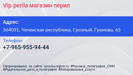 Vip perila, магазин перил по адресу 364031, Чеченская республика, Грозный, Громова, 65 в дальнейшем Организация, размещена в следующих категориях: