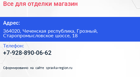 Все для отделки, магазин по адресу 364020, Чеченская республика, Грозный, Старопромысловское шоссе, 18 в дальнейшем Организация, размещена в следующих категориях: